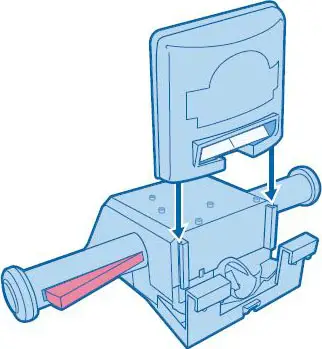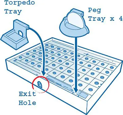 The torpedo tray: Slot the torpedo tray into the position shown in Figure 2, by fitting it into the ocean grid holes. Then slot the 4 peg trays into their holes (two trays on each side of the ocean grid).