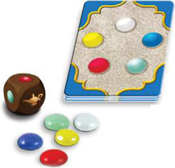 On his first turn, each player rolls the die and takes one stone of the color rolled. If "Choice" is rolled, any color stone may be chosen. On subsequent turns, each player may either roll the die for another stone or "trade" stones in his possession.
