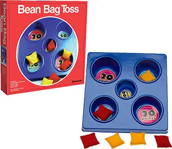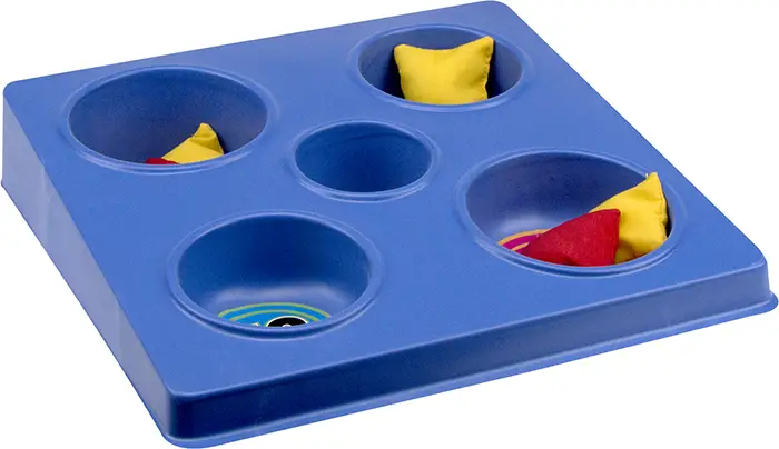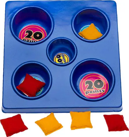 One player tosses all three of their bean bags towards the game base. Add up the score and mark it down.