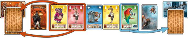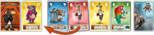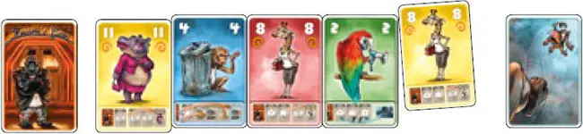 The overview cards are placed with their backs up. The number of points indicates how many points the owner of an animal gets if this animal reaches the Beasty Bar.