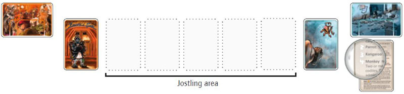 Explanation: In the Jostling area, all played cards - put next to one another face up - form a "waiting line". Each newly played animal first has to get in line, that means, further away from Heaven's Gate than all the animals already laid out (see example 1). The Jostling area can never contain more than 5 animals.