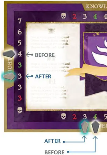 You have a Might of 4 and attack a Werewolf on your tile. You roll 4 dice and get a result of 5. The traitor rolls an 8 for the Werewolf. You take 3 physical damage and choose to lower your Might 2 spaces (from 4 to 3) and your Speed 1 space (from 4 to 3), sliding the clips on your Family card as shown.