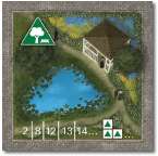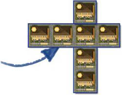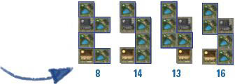 Score each set of shops separately. The example to the right scores 16 points for a row of four shops, plus 2 points for the single shop and 5 points for the column of two shops for a total of 23 points.