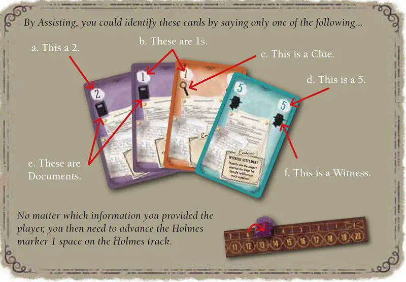 Whenever a player does the Assist action, the Holmes marker advances 1 space on the Holmes track.