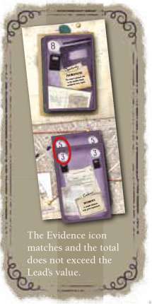 Choose one of the unconfirmed Leads and play an Evidence Card from your hand below that Lead. When playing an Evidence card to a Lead, your goal is to match the Lead's icon and reach that Lead's value.