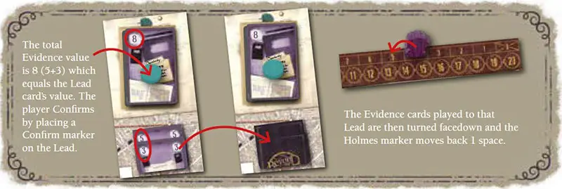 Place a Confirm marker on a Lead with as much Evidence as its value. Holmes moves back 1 space.