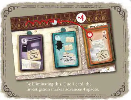 Players must ensure that the evidence they gather is solid. To do this, they must gather enough eliminated Evidence to bring the Investigation track to exactly 20.