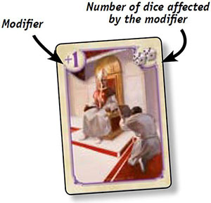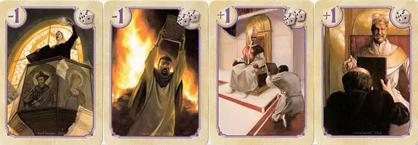 A Church card gives its owner the power to modify the number of Victory Points available by adjusting one or more dice on the Scriptorium. A player who acquires a Church card may decide not to use it, in which case it is discarded.