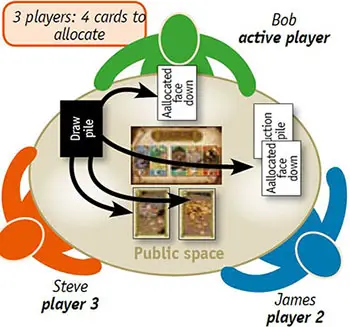 When you are the active player, you will "allocate" a designated number of cards (see chart below), and then give the remaining players an opportunity to draw a card from the public space.
