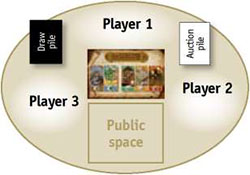 Note: At the start of the game, when the first active player allocates a card to the Auction pile, this will begin the Auction pile. This pile will grow as the Gift Phase continues and these cards will be purchased during the Auction Phase.