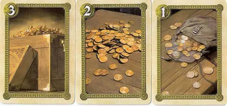 - 2-player game: Discard 6 Gold cards (2 of each value), and then an additional 21 random cards.