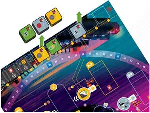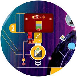 Each of your robots placed in a workstation gives you the right to roll a die of the color associated with that workstation. Take these dice from their respective supplies (limited by their availability), roll them, and place them in the standard area of your compartment.