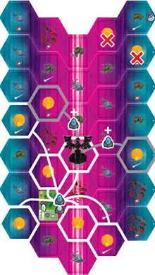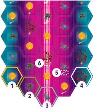 After flipping this strip over and placing it in the last position, cover its middle hex with the Planet Spes tile. Now the planet Spes is in sight! The objective of this long voyage will soon be attained!