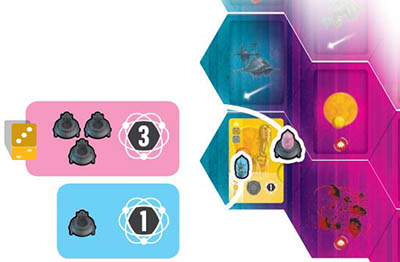 Take 1 resource, 1 Damage/Debris cube, and 1 ship, and place them in the corresponding storage areas on your player board.