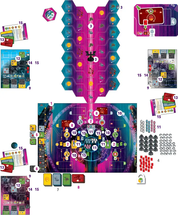 To finish the setup (15), choose a first player, who takes the First Player token (this token will be used when the end of the game is triggered). Give each player the player aid with the number corresponding to their position in the turn order (first player, then clockwise).