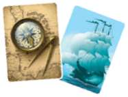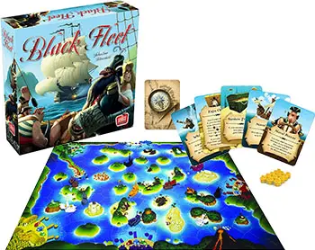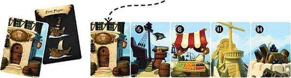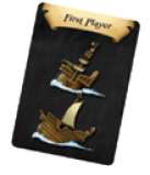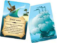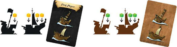 Each player takes the ships matching the color of their card, (a merchant able to hold. 3 goods, and. a pirate which can only hold one) and put these ships in front of them.