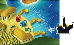 Before, during, or after its movement, a pirate carrying a treasure can bury it on the beach space on which it is. The cube is returned to the stock of the port of its color. You win the number of doubloons indicated on the beach.