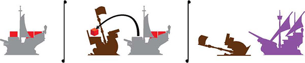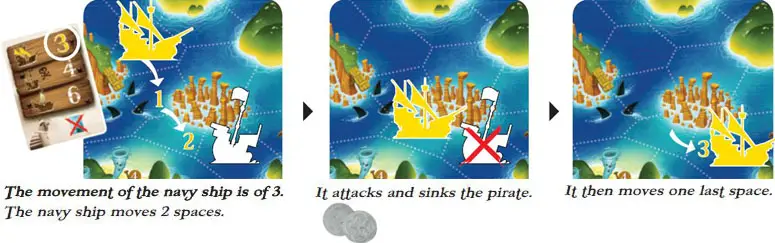 Before, during, or after its movement, the navy ship you are moving can attack an adjacent opposing pirate. That ship is sunk and returned to its owner. You win 2 doubloons. If it was carrying a goods cube, the cube is returned to the stock of the port of its color.