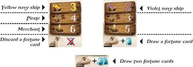 You can also move one of the navy ships (the one shown on the card you've just played). Each ship can move a number of spaces ofyour choice, less than or equal to the value given on the line corresponding to it on the movement card.