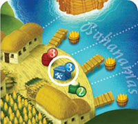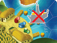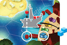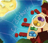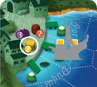The first player places his merchant ship on one of the three spaces adjacent to the port of his choice and. loads 3 goods matching the port in question. The other players do the same going clockwise.