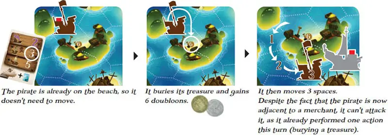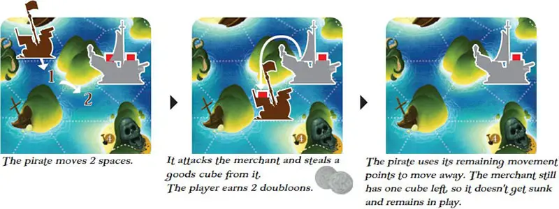 Before, during, or after its movement, an empty pirate can attack an adjacent opposing merchant. It steals one good cube from it, which is placed in its hold. The owner of the pirate ship earns 2 doubloons. If the merchant is now empty, it is sunk and returned to its owner. A goods cube held by a pirate ship is called a treasure. Attacking is an action.