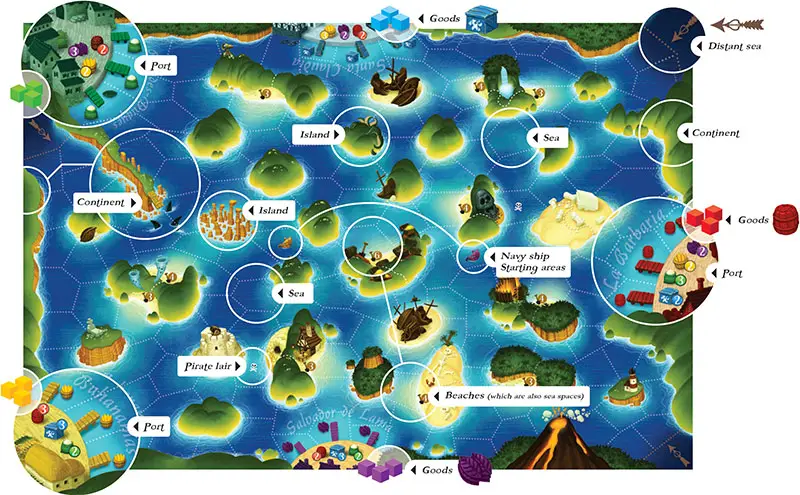 Pirate ships begin the game empty and out of the board. On their turn, each player moves their pirate ship into the board, starting from one of the distant sea zones.