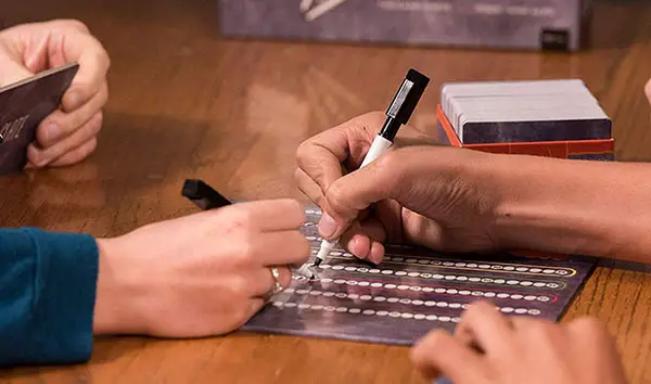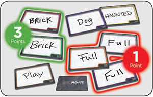 Tally up the scores accordingly - 3 points for pairs of matching words, 1 point for words that more than two people match, and 0 points for any unmatched word - and mark the player score track on the Score Board.