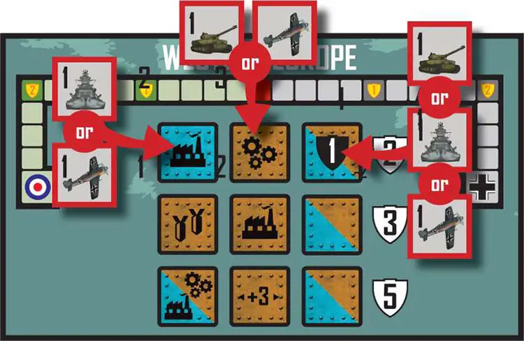 During the game, the number of unit tokens in the reserve of each player can vary. Each reserve starts with three unit tokens, but due to the effects of industrial production, bombing, and so on, the reserve can increase or decrease in size, and offer players better or worse choices of available troops.