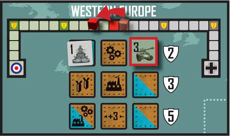 The Allied player places a 3-strength army to close this campaign. He moves the battle marker three spaces in his favor, gaining one war victory point from the victory point icon on the battle track, and gains a further two war victory points for closing this campaign.