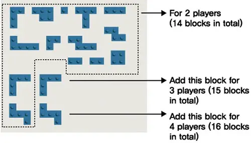 Place the game board in the middle of the table. Each player takes his/her own color blocks. Each player takes 14 blocks for 2 players (15 blocks for 3, 16 blocks for 4)