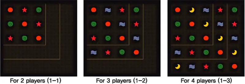 The players choose a starting player. This game is of advantage to the starting player. So starting player gets penalty tokens according to rule before the game begins. Even the second player gets a penalty token when players are three or four.