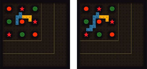 The player who surrounds a point block with the most number of blocks than others can get the point block. Around a point block, there are 12 spaces which can be placed by blocks.