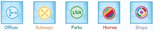 1 At 2 players remove 6 tiles of each Building type (Offices, Subways, Parks, Homes, and Shops) from the game; at 3 players remove 2 each. There are multiples of each Shop tile. When removing them, never remove duplicates of the same Shop.
