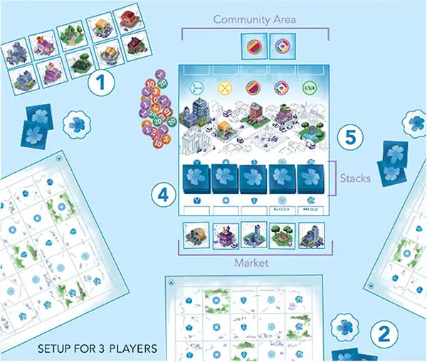 4 Place the Town Square board in the middle of the table. Place Bloom Points nearby.