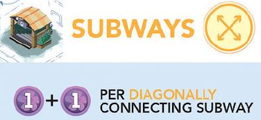 Subways score points similarly to Offices, but must be connecting diagonally at the corners instead. Direct, non-diagonal adjacency does not count.