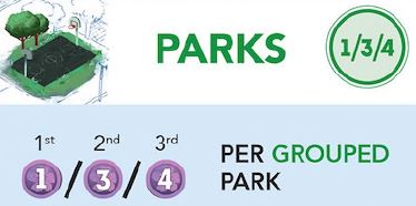 Parks score 1 point for the placed Park tile, 3 points if it is the second grouped Park tile, and 4 points if it is the third grouped Park tile. Any additional Park tiles in the same group score 0 points. You can have multiple Park groups.