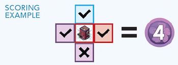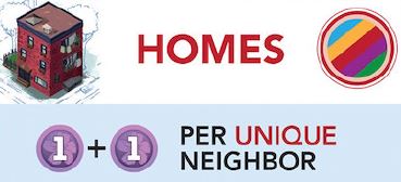 Homes score points based on neighboring Building tiles that are uniquely different types than the others surrounding the Home tile.