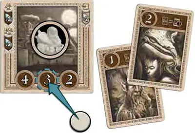 Example: Natasha just moved 2 spaces from the Hospice to the City Residence. Now, she can contribute to its reconstruction. The City Residence has 3 brown Contribution Spaces: 4, 3, 2.