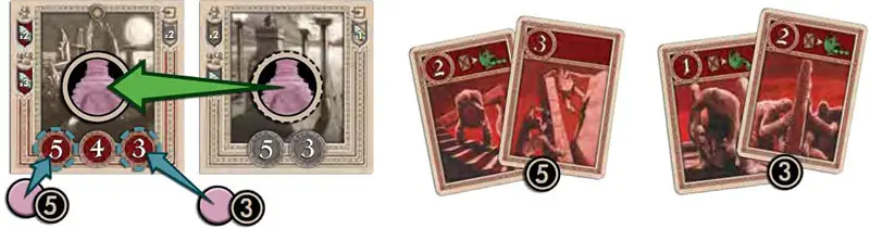 Natasha then discards 2 brown cards with a total value of 3 to place her marker on the '3' space. The next player that ends their movement on the City Residence will only have 2 options of Contribution Spaces: 2 or 4.
