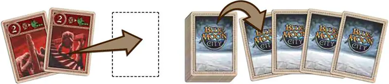 The diverse peoples of Blue Moon are represented in the game by People cards. Each card has a value ranging from 1 to 3. These values represent your contribution to the reconstruction of the Buildings throughout the city.