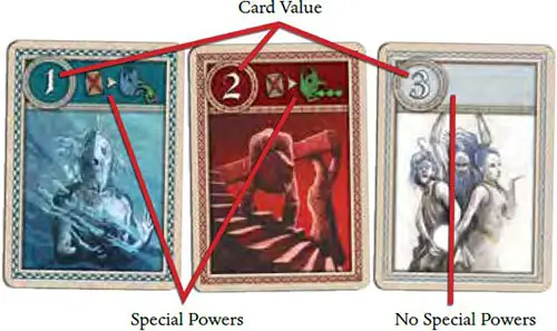 Cards with a value of 1 or 2 often have special powers that can be used on your turn. Cards with a value of 3 have no special powers.