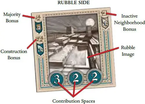 The Rubble side of each Building tile is composed of its Rubble image, Contribution Spaces, Majority Bonus, Construction Bonus, and Neighborhood Bonus.