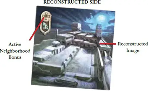After a Building has been reconstructed, the tile will be flipped over to its Reconstructed side and show only its Neighborhood Bonus, which is now active.