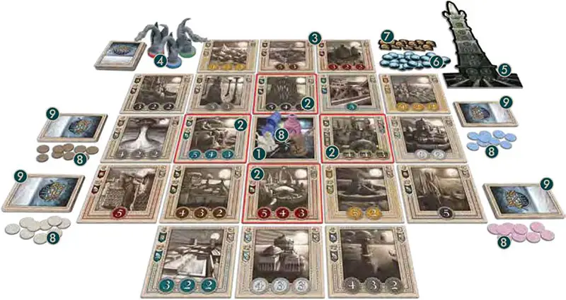 Contribution Spaces: Each Building tile has spaces that show a color and a number. These spaces show how many contributions are necessary to reconstruct the building.