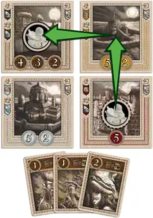 Example: Aman finished his movement on the Earth Temple. There are 3 available Contribution Spaces: 5, 4, 3 in red. He has a total value of 8 red (3, 2, 2, 1) in his hand.
