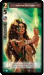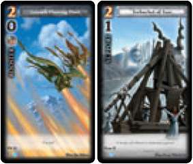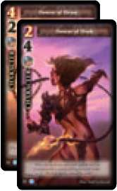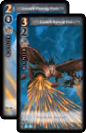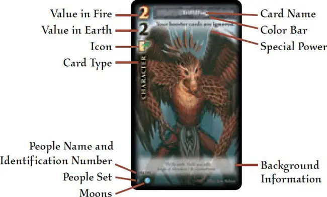 Many cards have values in fire and earth. Some cards contain special power texts (under the color name bar). When a card with a special power is played, the text is read out to the opponent: "I" referring to the player of the card and "you" to the opponent.