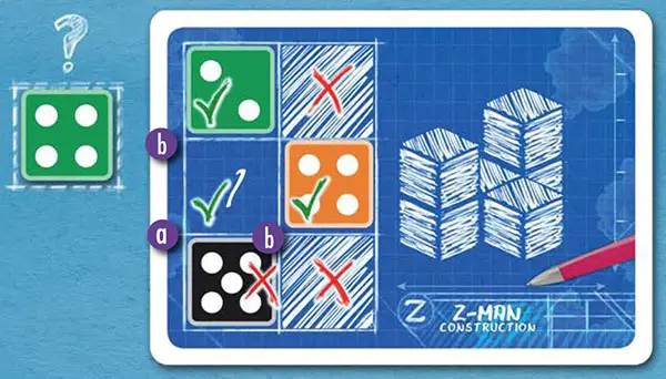 The number in each space indicates the height (in dice) of the building in that space. Dice may not be placed in the hatched spaces.