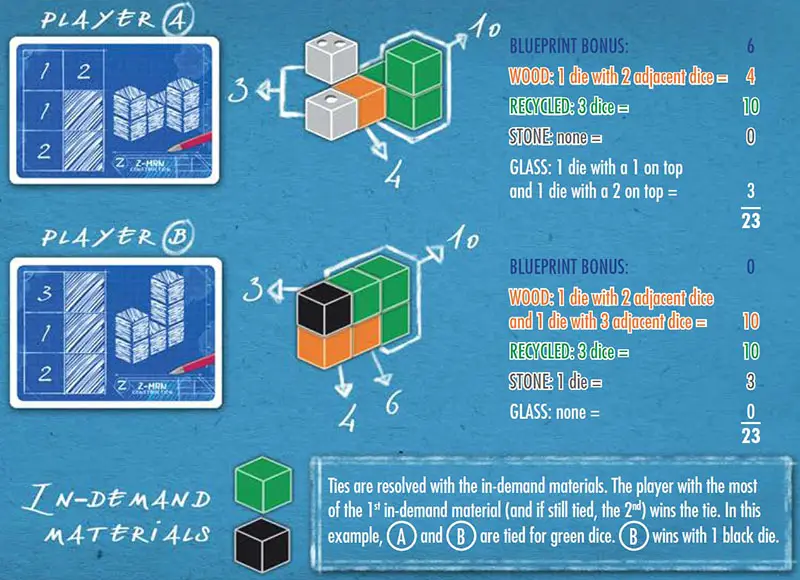 If two or more players are tied for an Award, give the Award to the tied player with the most dice of the first "In-Demand Materials" color. If players are still tied, give the Award to the tied player with the most dice of the second "In-Demand Materials" color.