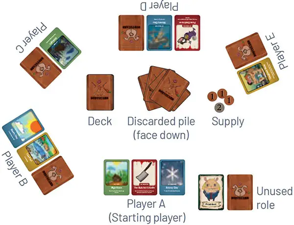The President will then issue 1 role card (face down) to each player. After all players check his own role card, place the role card face down in front of himself.