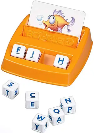 Because the Boggle Jr. game is "self-correcting"-the child can see the right answer and check the spelling-he/she can play these games alone or with a sibling or friend, as well as with you.
